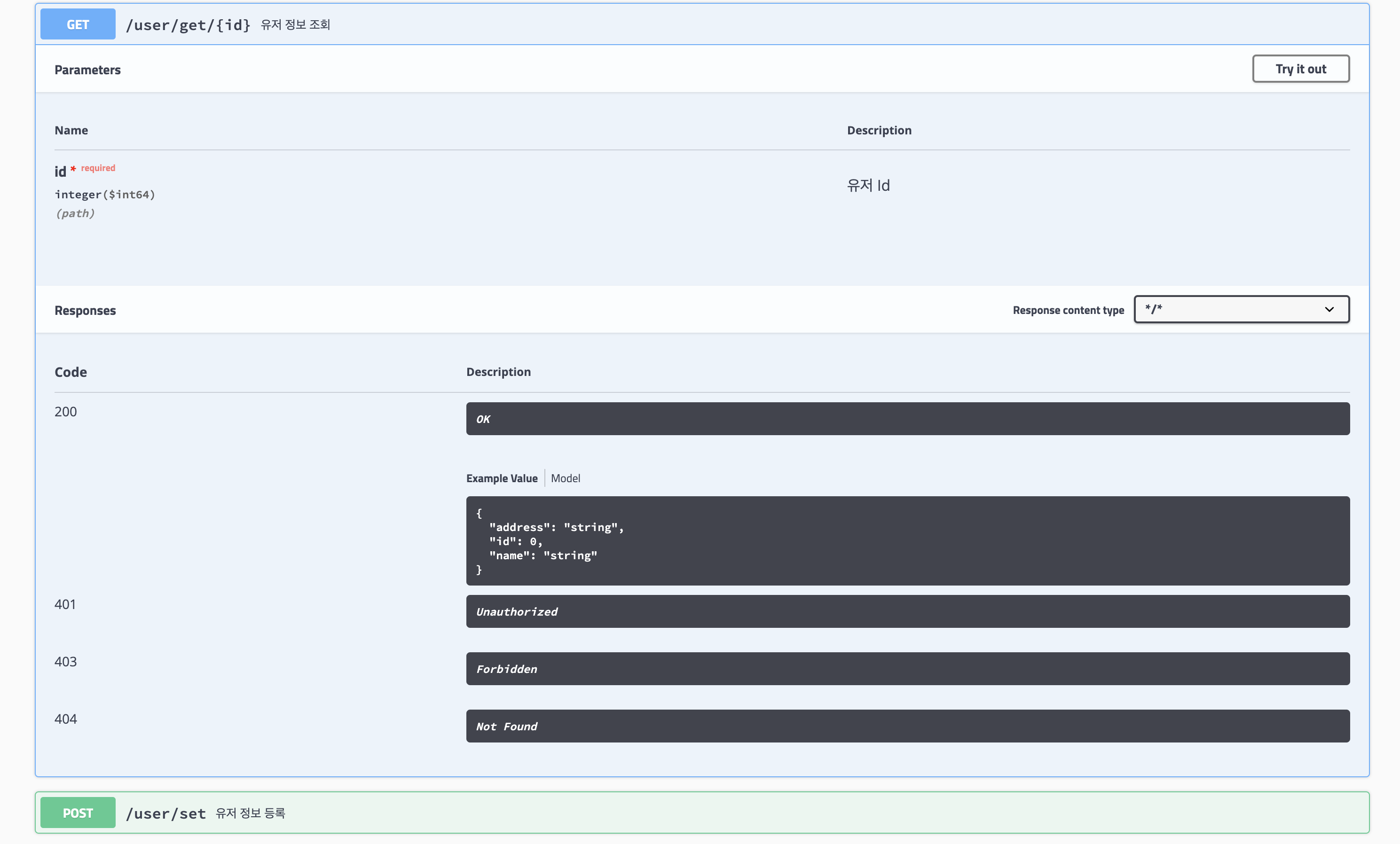우측 상단에 Try it out이 있다. 누르면 파라미터를 넣는 창이 나온다.