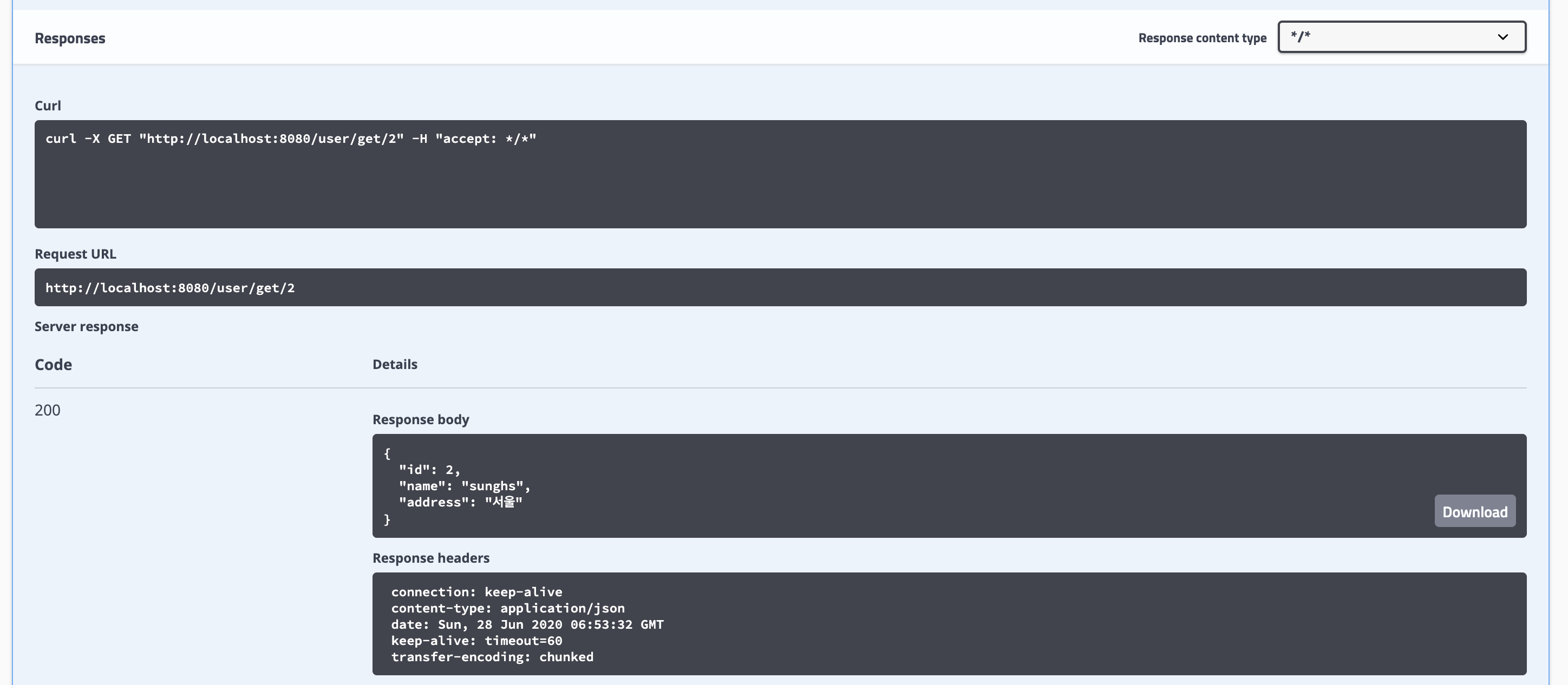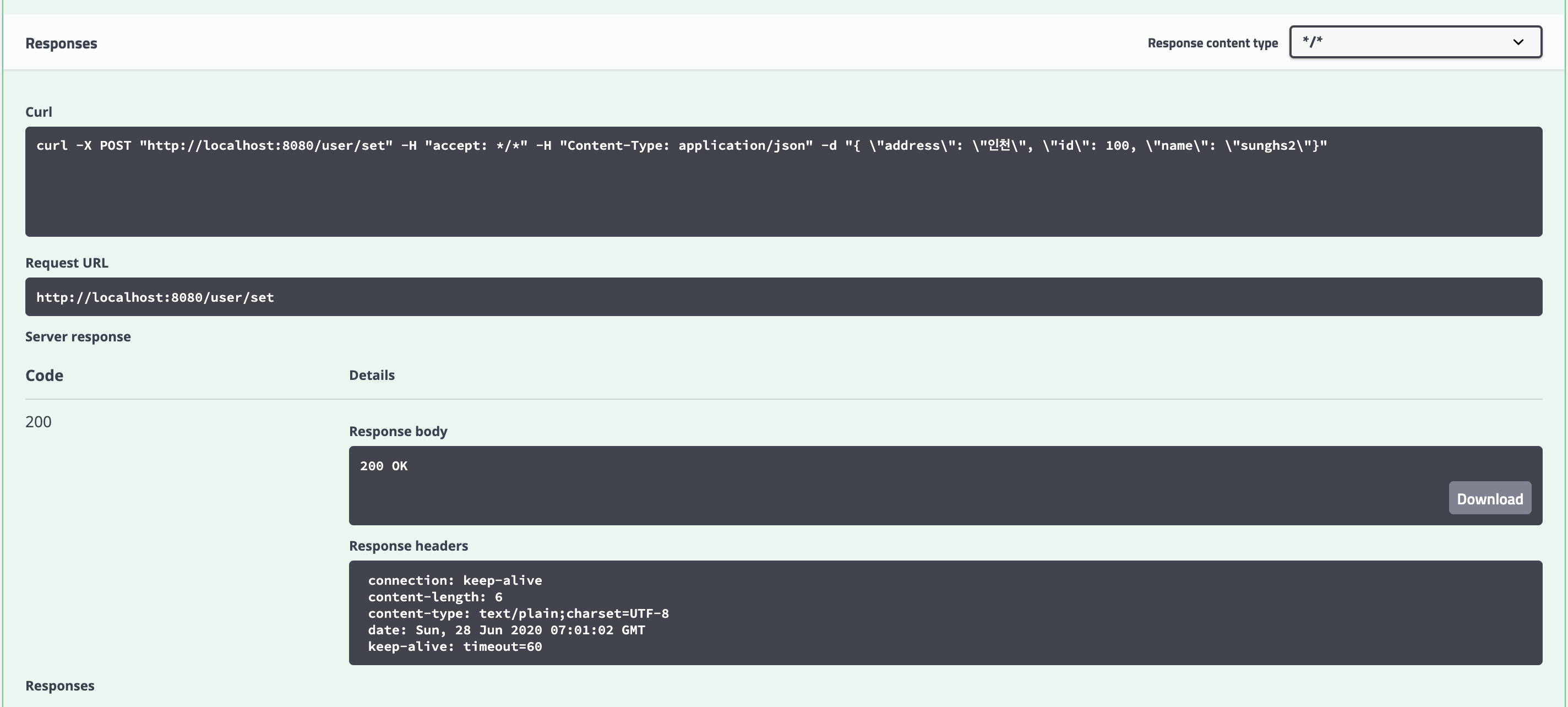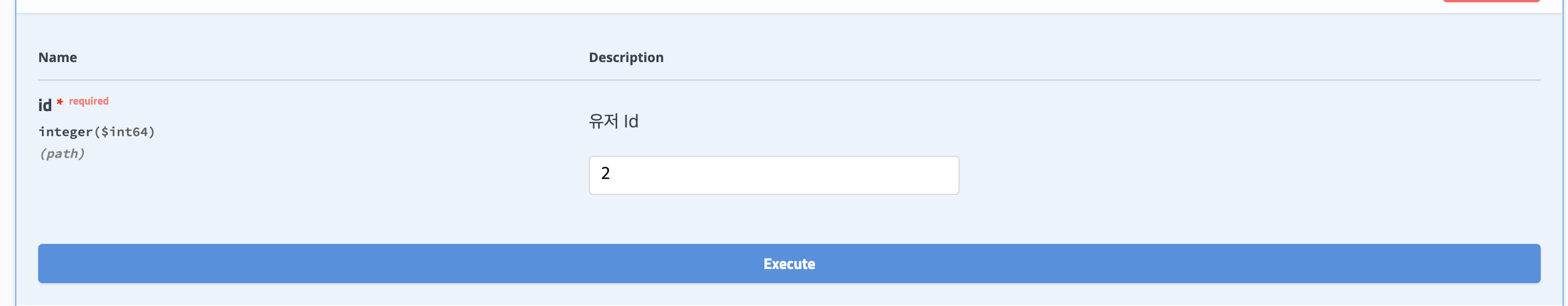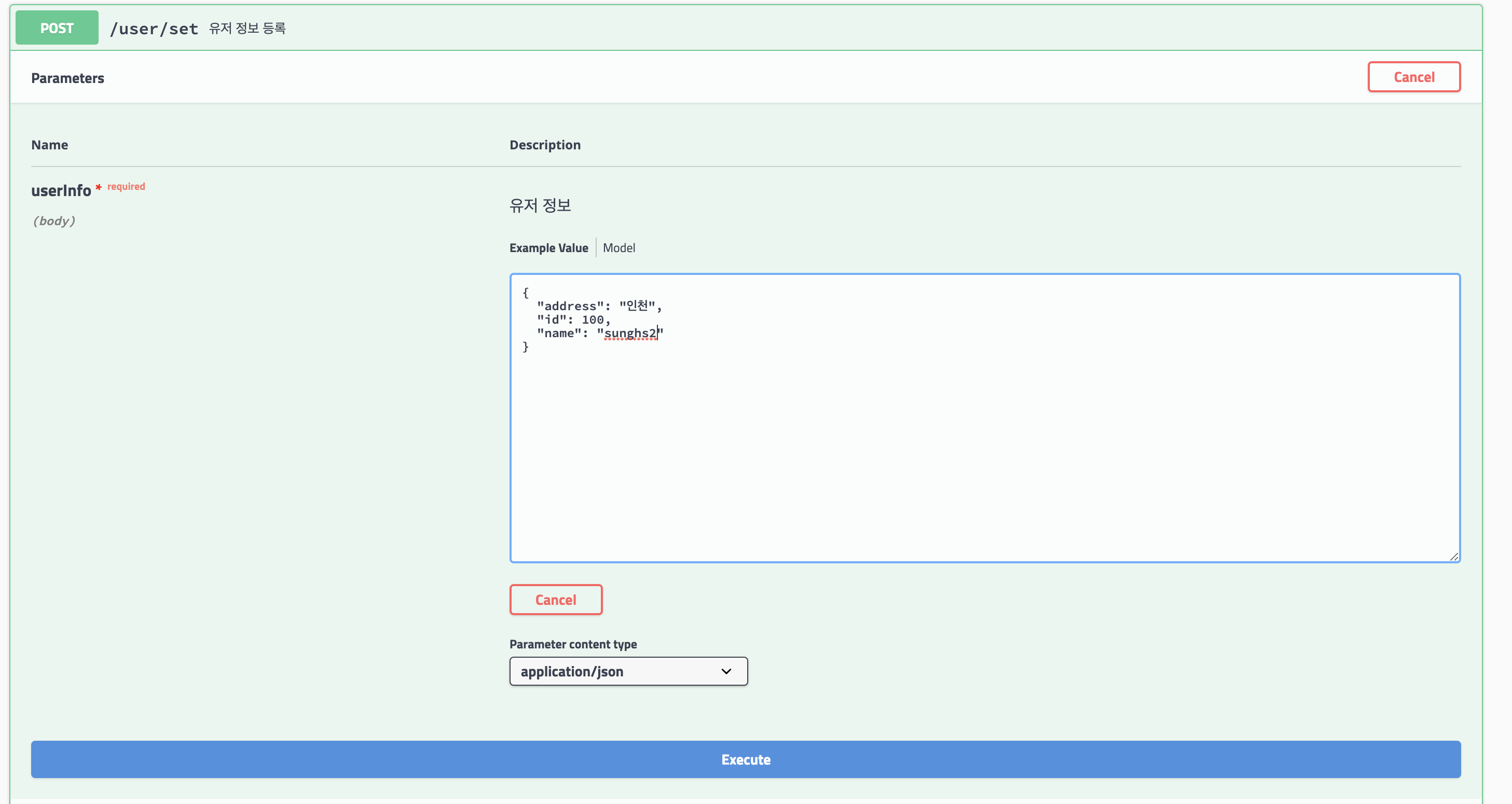 값을 넣고 아래 execute를 누르면 하단에 response가 날아온다.