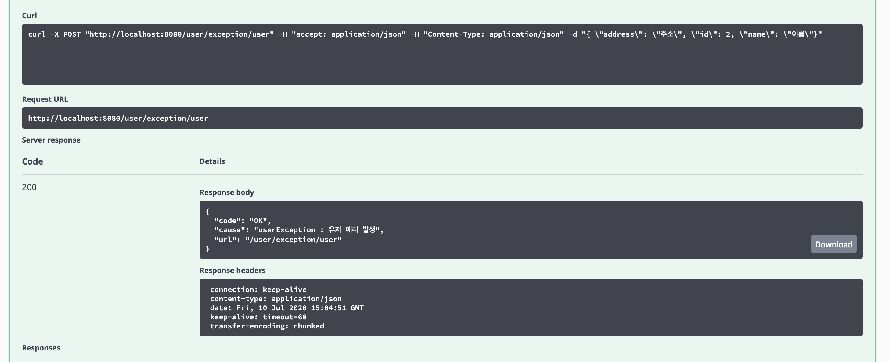 위에서 모든 Throwable 타입의 예외는 defaultHandler를 타서 FORBIDDEN status를 response하게 되어있으나, 아래 RuntimeException을 상속받아 구현 한 UserException은 userHandler를 타서 200 OK를 response 하게 된다.