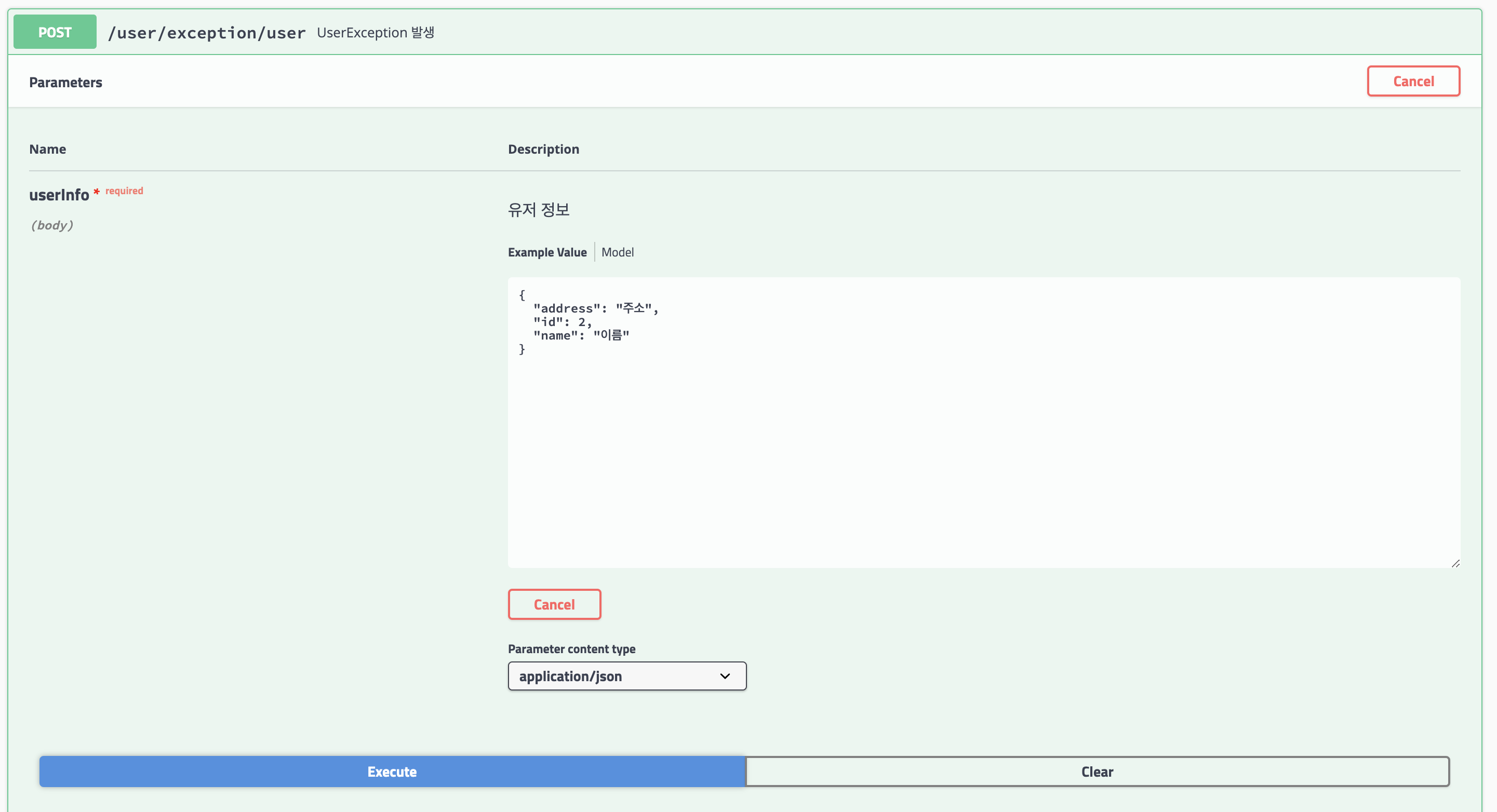 public String userException(@ApiParam(value = "유저 정보", required = true) @RequestBody final UserInfo userInfo) {
