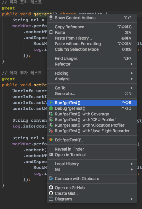IntelliJ 기준 테스트 할 메소드 명에 우클릭 -> run을 누르면 실행 할 수 있다.