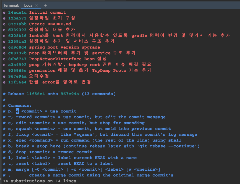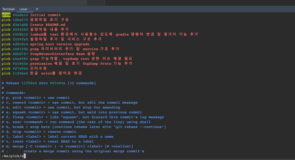 위와 같이 rebase 목록이 나온다면 바꿔야 할 commit list pick 부분을 e로 바꿔주면 된다.