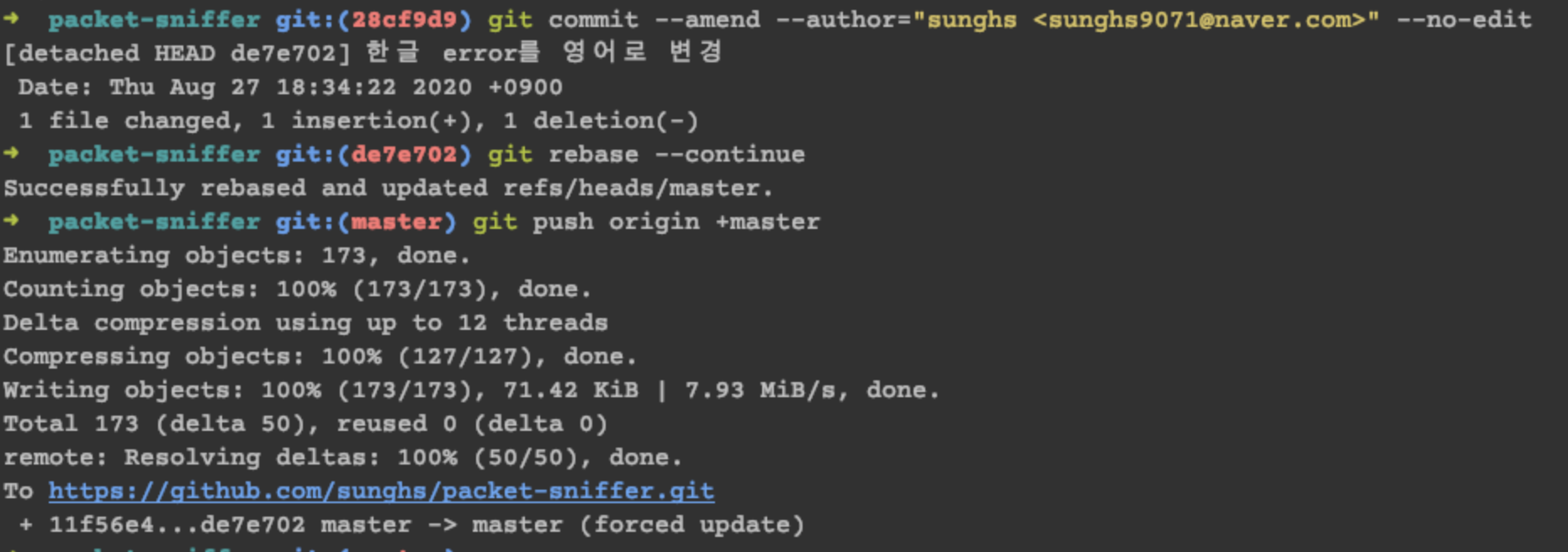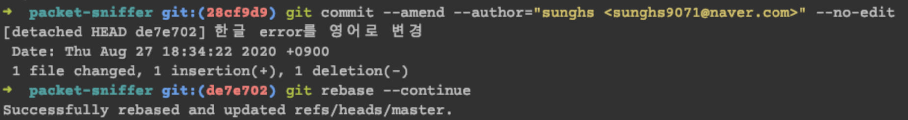 그럴 때 이미 서버로 push 해 버린 author를 변경하는 방법이다.
