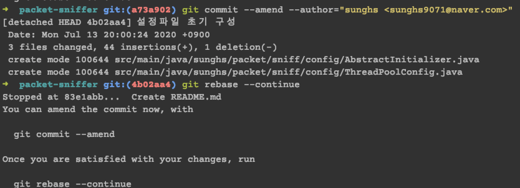 이 config 의 author를 바꾸지 않으면 이후 rebase 작업 시 author 와 commit 계정이 달라지게 된다.