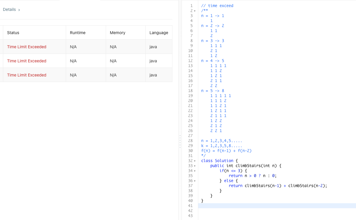 이상하게 피보나치 풀이법인 recursive 방법으로 풀면 Time Limit Exceeded 실패가 발생했다.