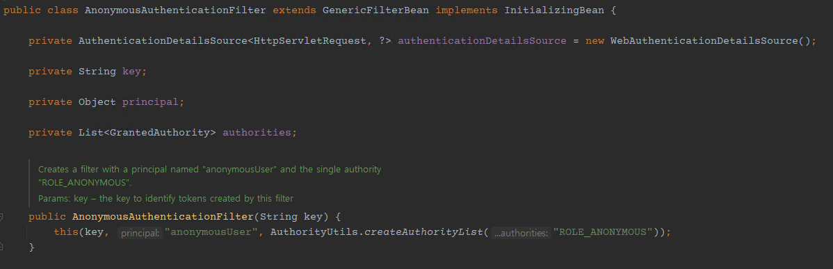 SecurityContextHolder 에 Authentication 값이 없으면 anonymous 권한을 세팅해서 넘기고, 값이 있는 경우 바로 필터로 위임합니다.
