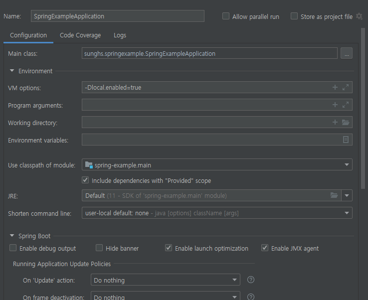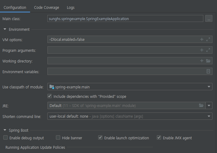 그리고 부트 실행 시 아래와 같이 VM OPTION을 넣습니다.