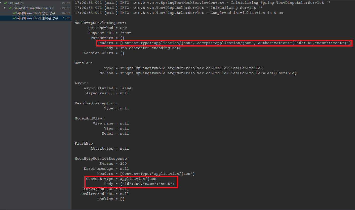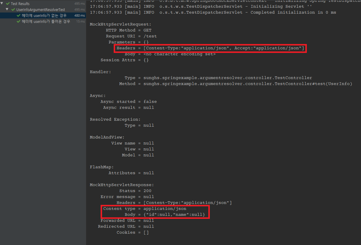 첫번째 메소드인 userInfoArgumentInvalidTest() 에서는 헤더에 아무것도 넣지 않고 테스트를 진행합니다.
