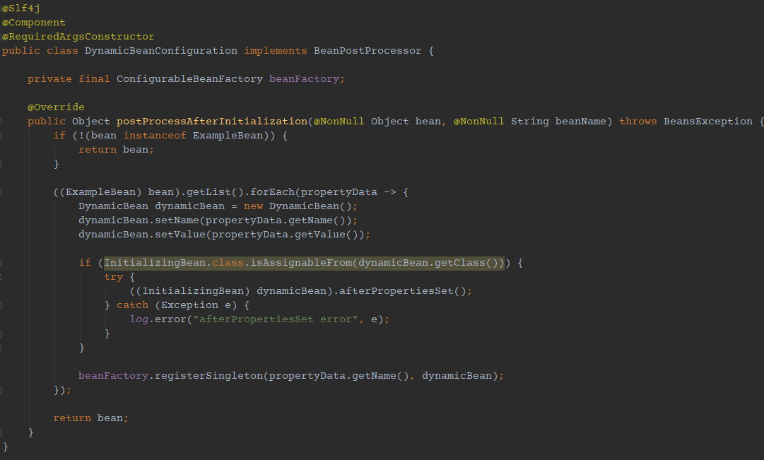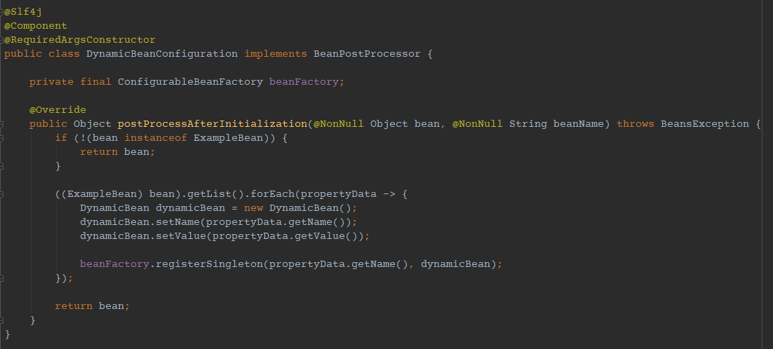 public class DynamicBeanConfiguration implements BeanPostProcessor {