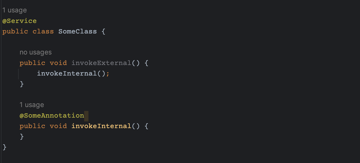 코드를 보면, 외부에서 invokeExternal() 메소드를 호출하고, invokeExternal() 호출 당시에 SomeAnnotation 이 붙은 invokeInternal() 메소드를 호출한다.
