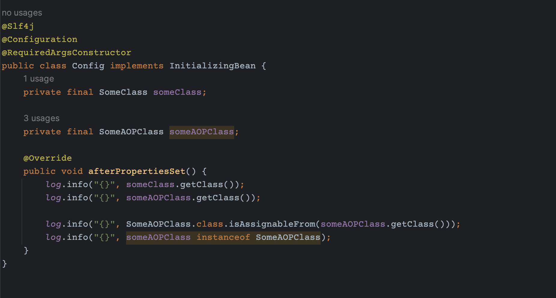log.info("{}", someAOPClass.getClass());afterPropertiesSet() 메소드의 1~2라인을 보면 클래스 이름을 로깅한다.
