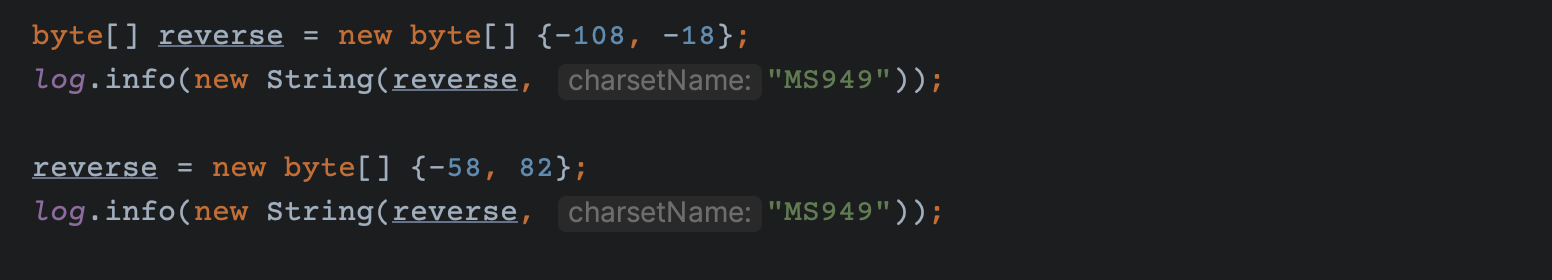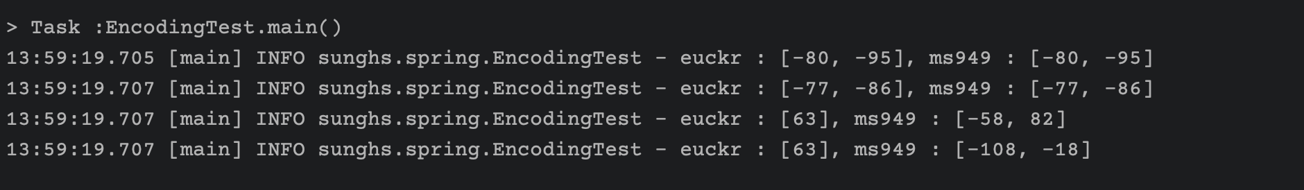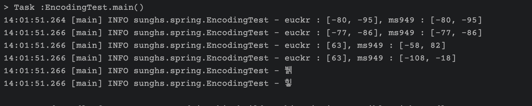 결국 둘중 하나는 계속 못보거나 아니면 콘솔 인코딩을 바꿔가며 테스트 해야하는데 번거로워서 바이트 코드로 바꿔 결과물만 출력해보면 알 수 있게 된다.