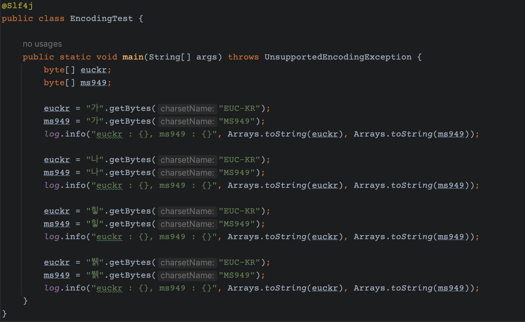 - 리터럴 한글 객체의 각 두 타입의 인코딩으로 byte 배열을 구함