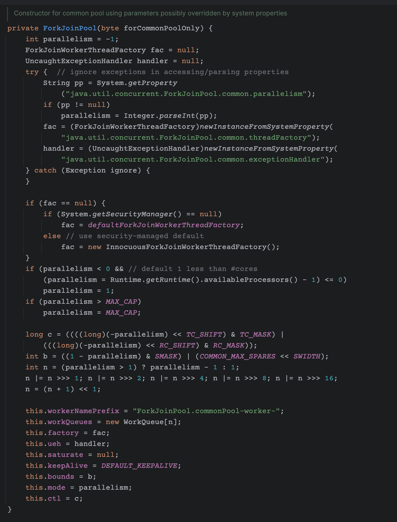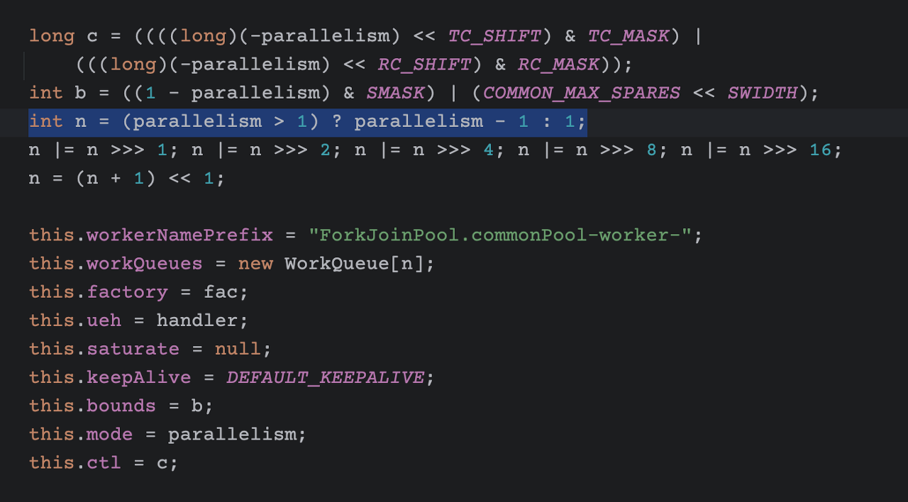 이 사진을 보면 System 변수에 java.util.concurrent.ForkJoinPool.common.parallelism 의 키값으로 값이 없는 경우 Runtime.getRuntime().availableProcessors() 값을 가져와 parallelism 에 담고, 최종적으로 n이라는 WorkQueue 사이즈 변수에 담는것이 보인다.