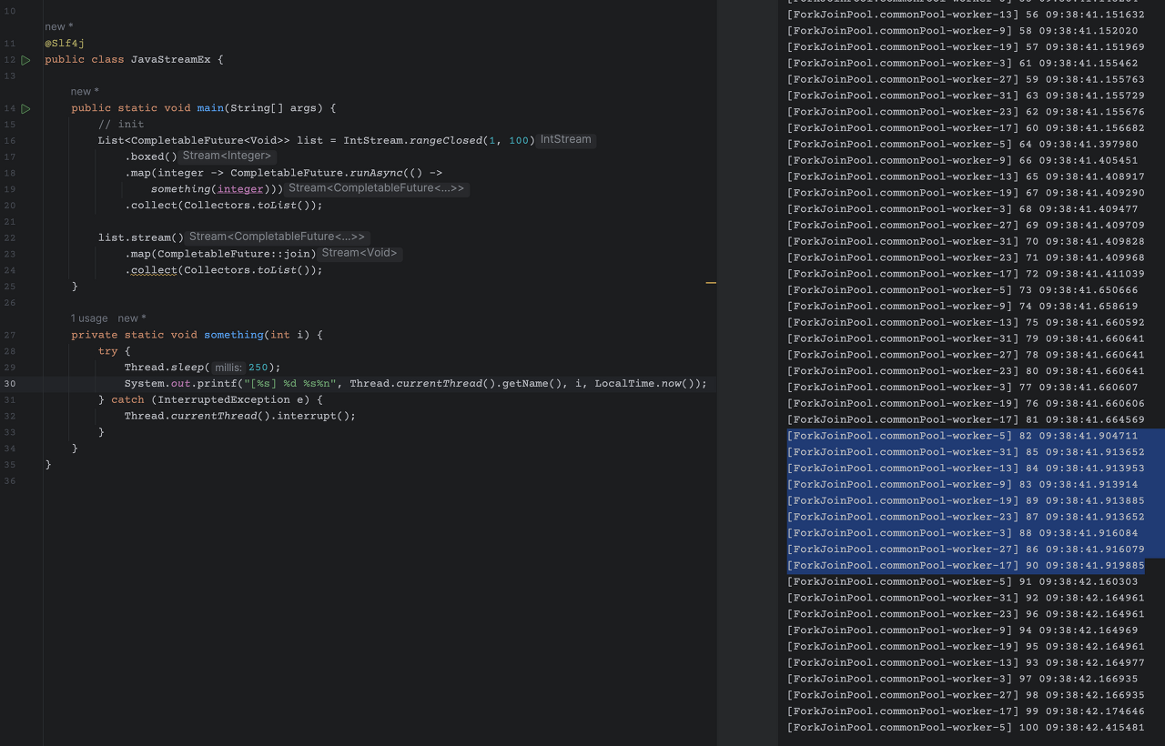 포크조인풀을 20개로 생성하고, runAsync() 인자로 해당 풀을 같이 넘겨주었다. 오른쪽 로그에서도 확인이 가능한데, 정상적으로 20개로 수행되었다.