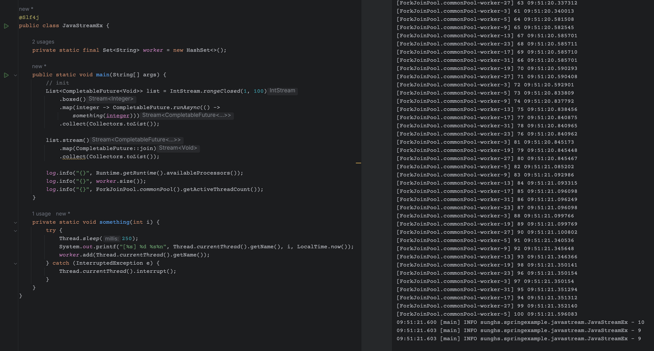 오른쪽 콘솔 하단에 보이듯, 예상과 같이 코어는 10개, HashSet에 등록된 Thread 이름은 9개, 포크조인풀의 사이즈도 9개였다.
