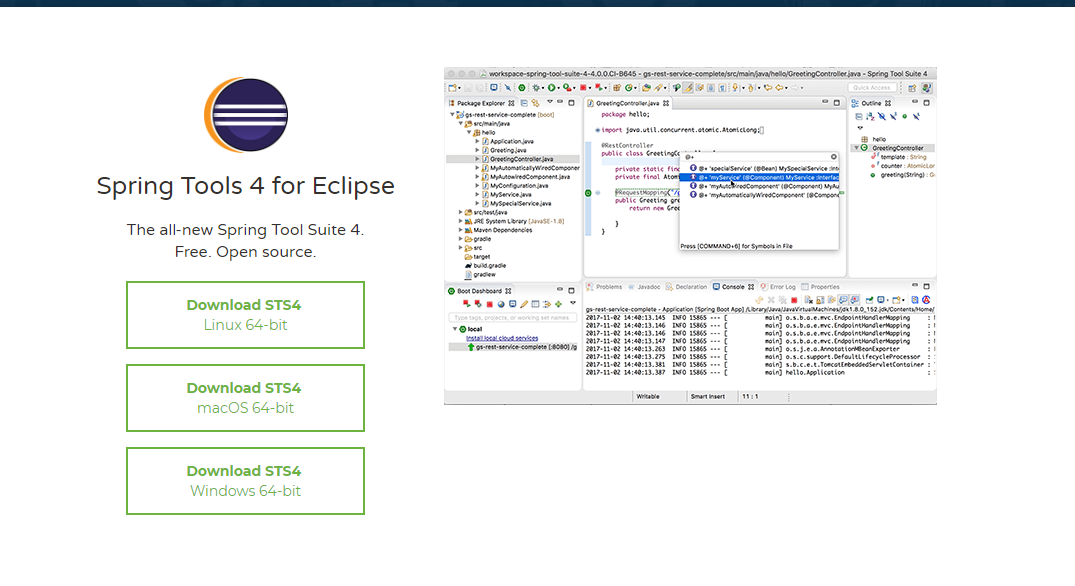 Spring Tools 4 is the next generation of Spring tooling for your favorite coding environment. Largely rebuilt from scratch, it provides world-class support for developing Spring-based enterprise applications, whether you prefer Eclipse, Visual Studio Code,
