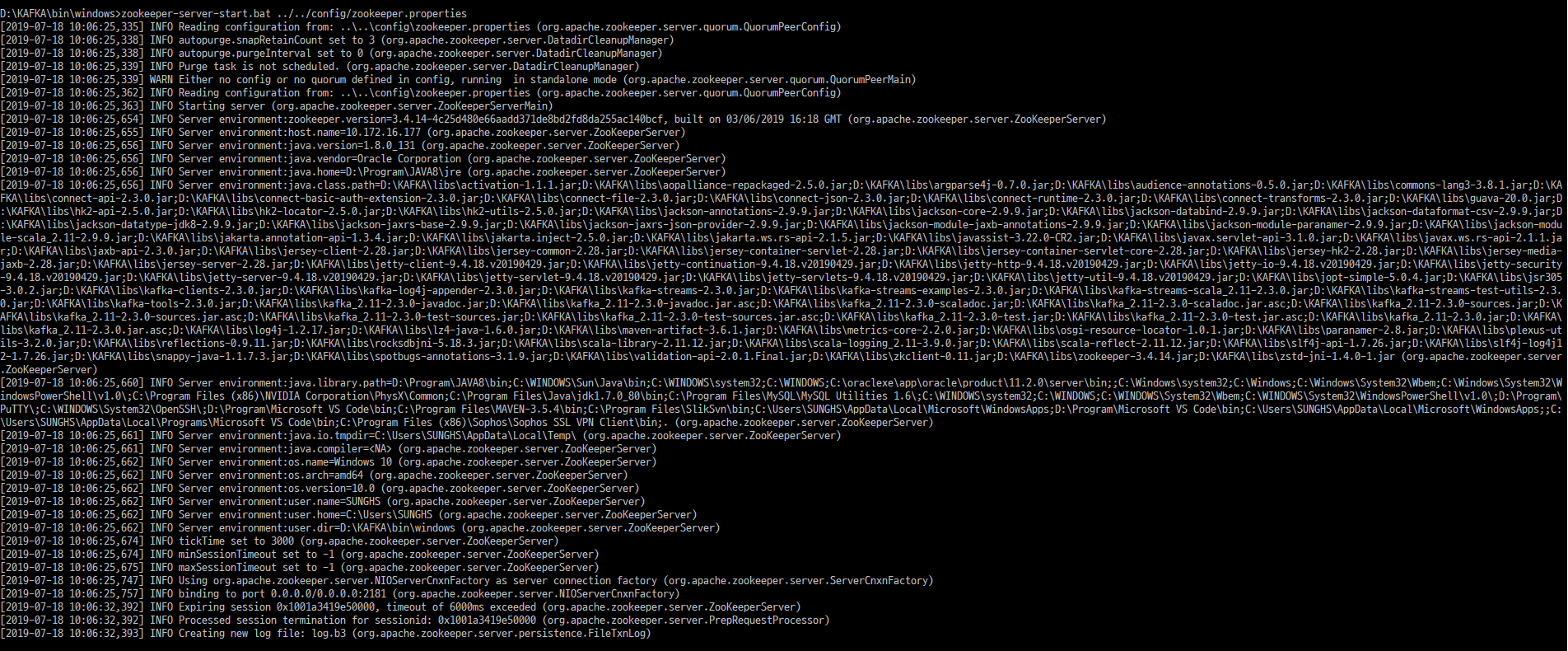 windows bat파일 위치에서 zookeeper-server-start.bat ../../config/zookeeper.properties